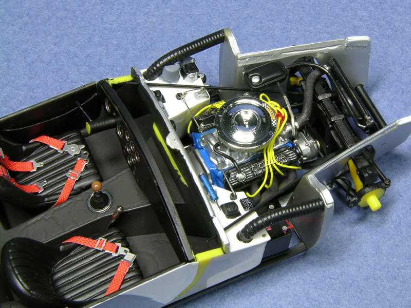 Ultimates were very good model kits. They included soft vinyl tires and a fret of photoetched parts. While the stock kit is very good, I added numerous scratchbuilt items. The blue metallic paint is a nail-polish color. The "skunk stripes" were included as decals, but I decided to mask and paint them instead of using decals.