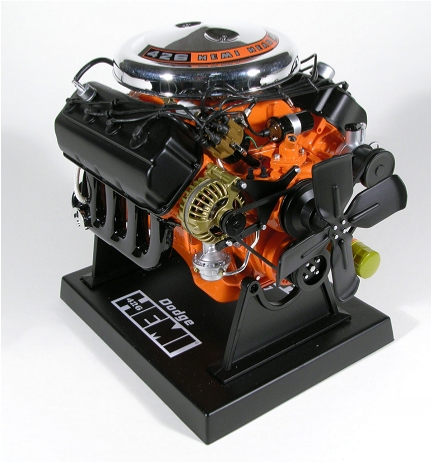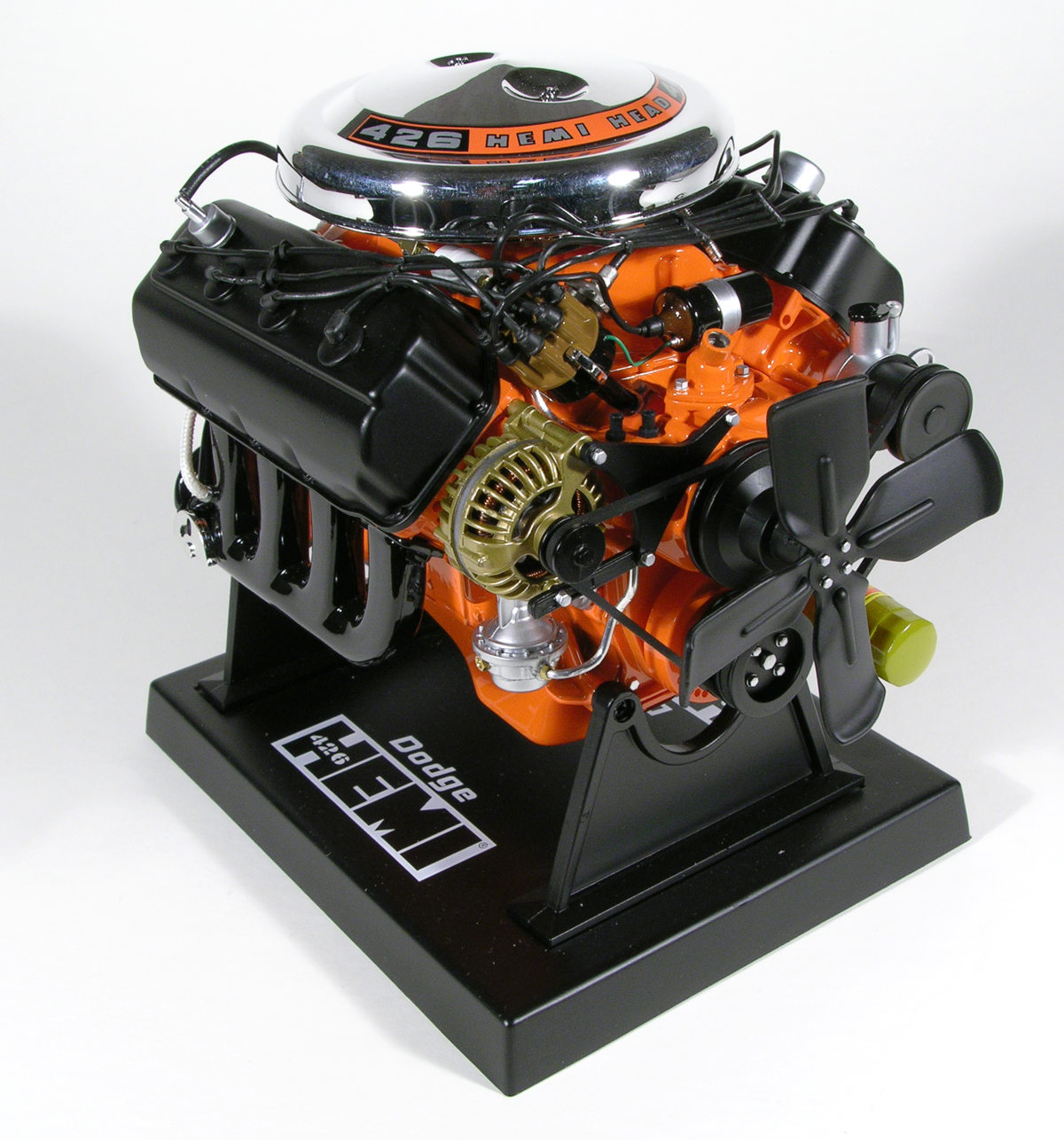 Pete built this highly detailed 1/6 scale Revell 426 Hemi Engine, and in the process corrected and enhanced many of the details. He added many miniature nuts/bolts/washers, fuel lines, throttle linkage return spring, and also scale vacuum tubing. Pete even went as far as hollowing out the alternator housing, and installing its internal stator wound out of copper wire.