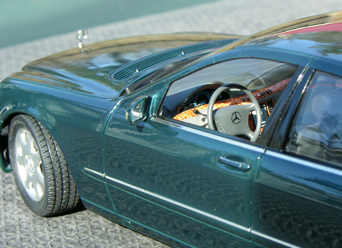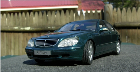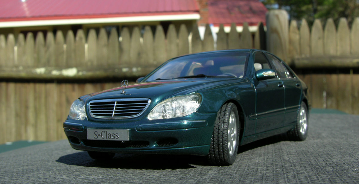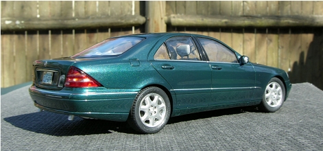 Protar (also repackaged as Revell) kit of Mercedes Banz S600. Curbside kit. Painted using Mercedes Touch-up paint. Silver trim is Bare Metal Foil. Added seat belts and metal transfer logos. Scratchbuilt reflectors behind headlight and taillight lenses. Also added directional lenses on the door mirrors. Added scale license plates.